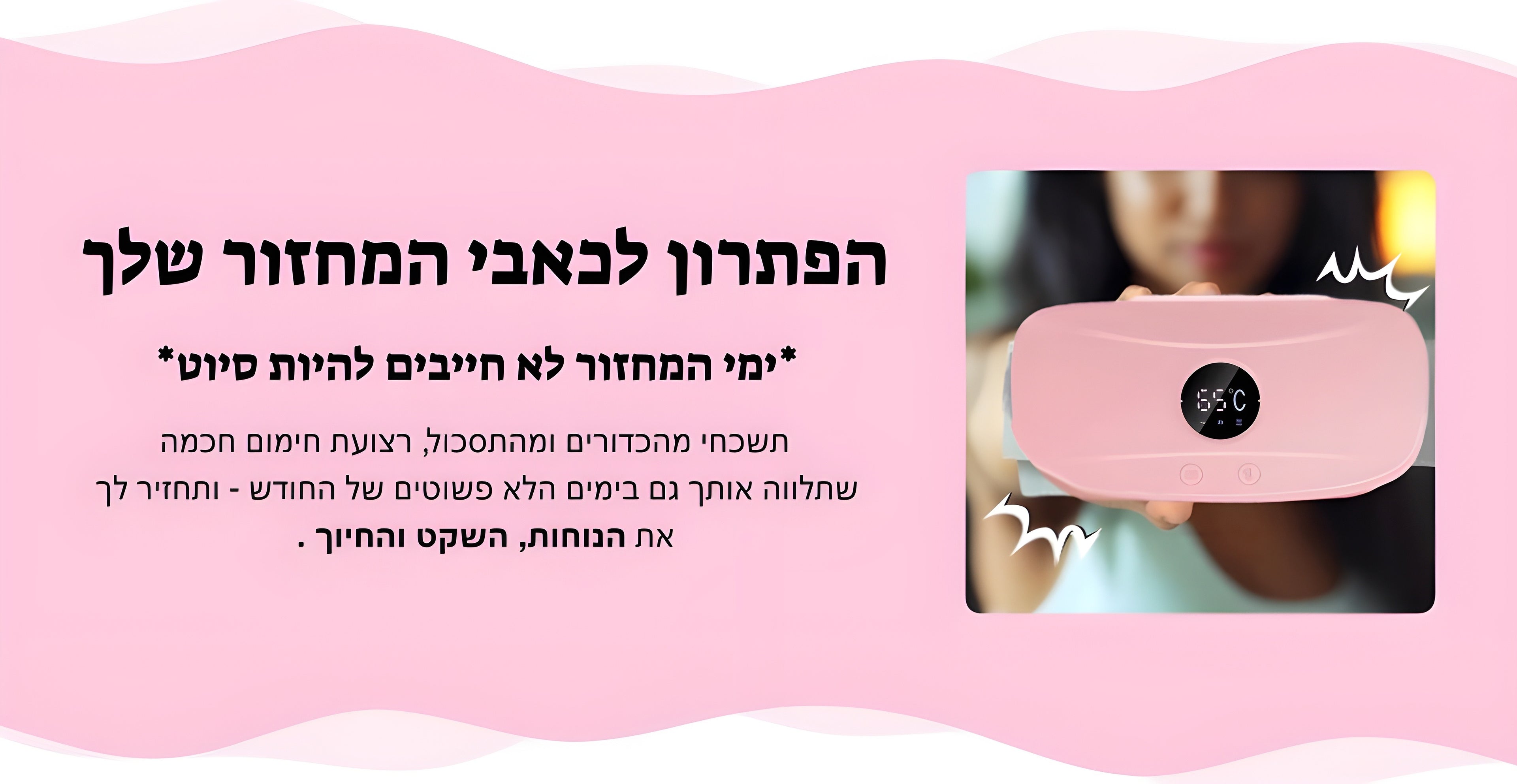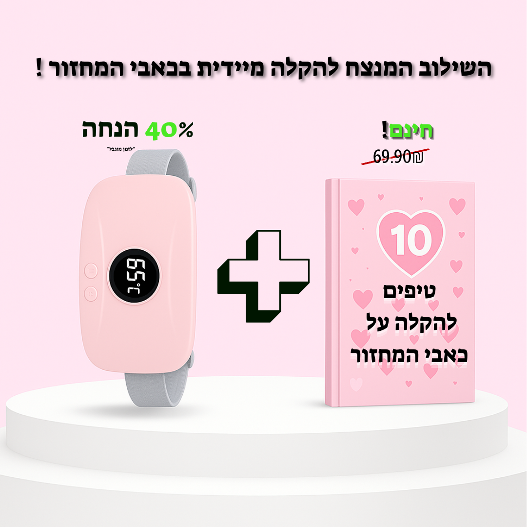 רצועת החימום שלנו משתמשת בטכנולוגיית חימום ועיסוי מתקדמת שמרגיעה את איזור הבטן התחתונה ומפחיתה את עוצמת ההתכווצויות. פשוט לובשים אותה, בוחרים את רמת החום הרצויה, ונהנים מהקלה מיידית - בלי תרופות, בלי תופעות לוואי.