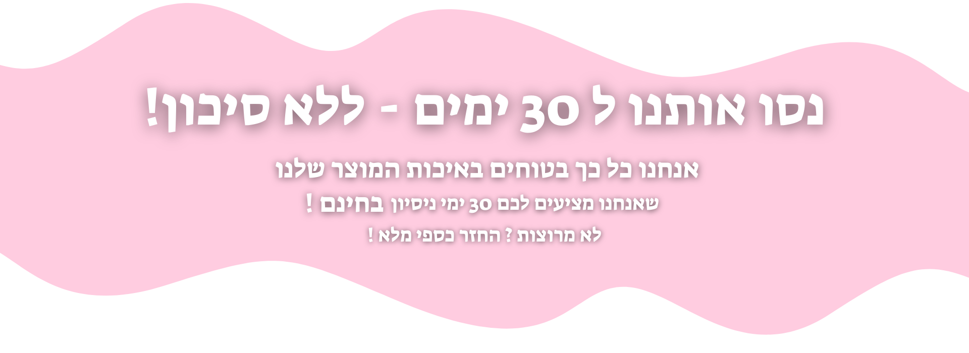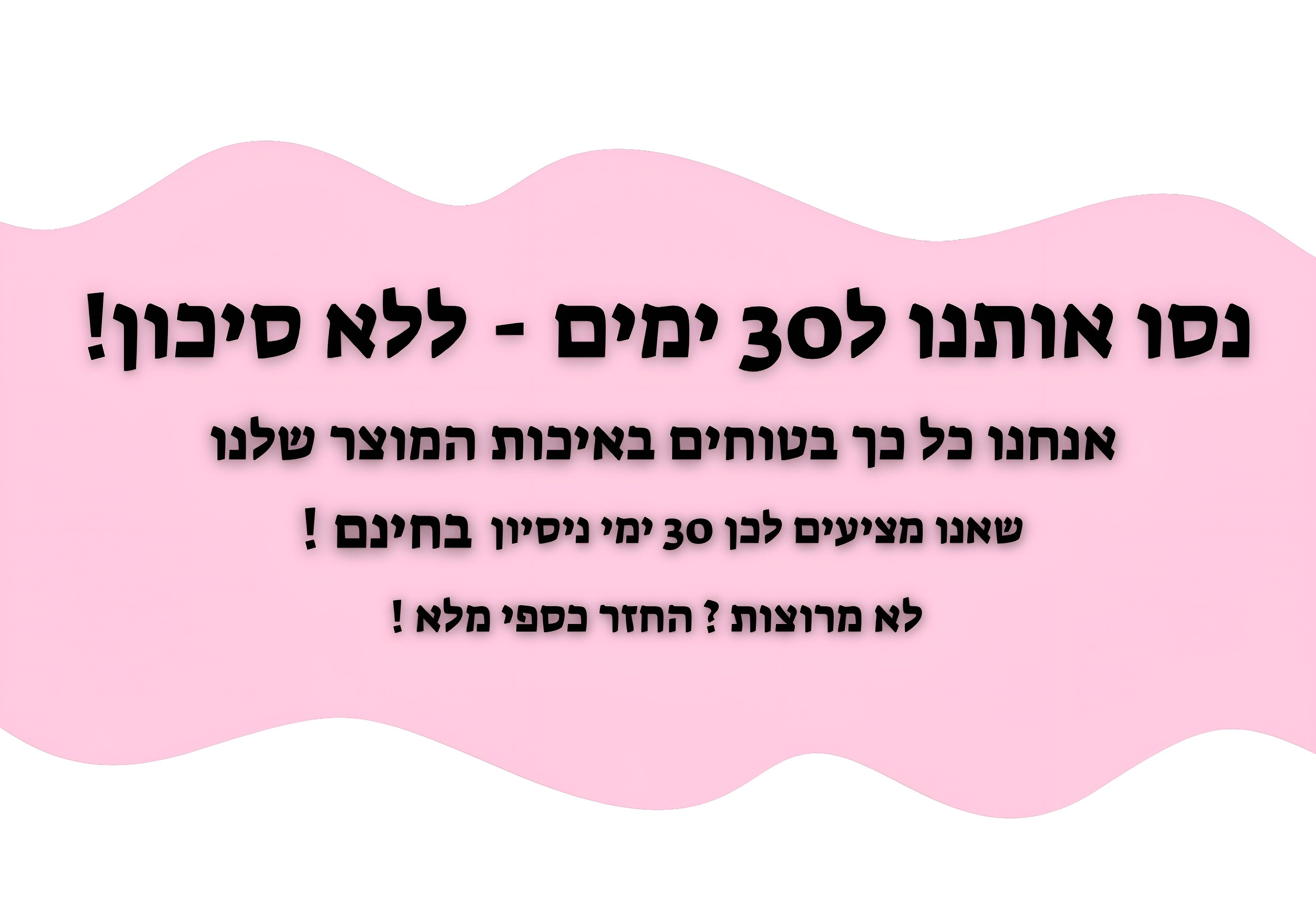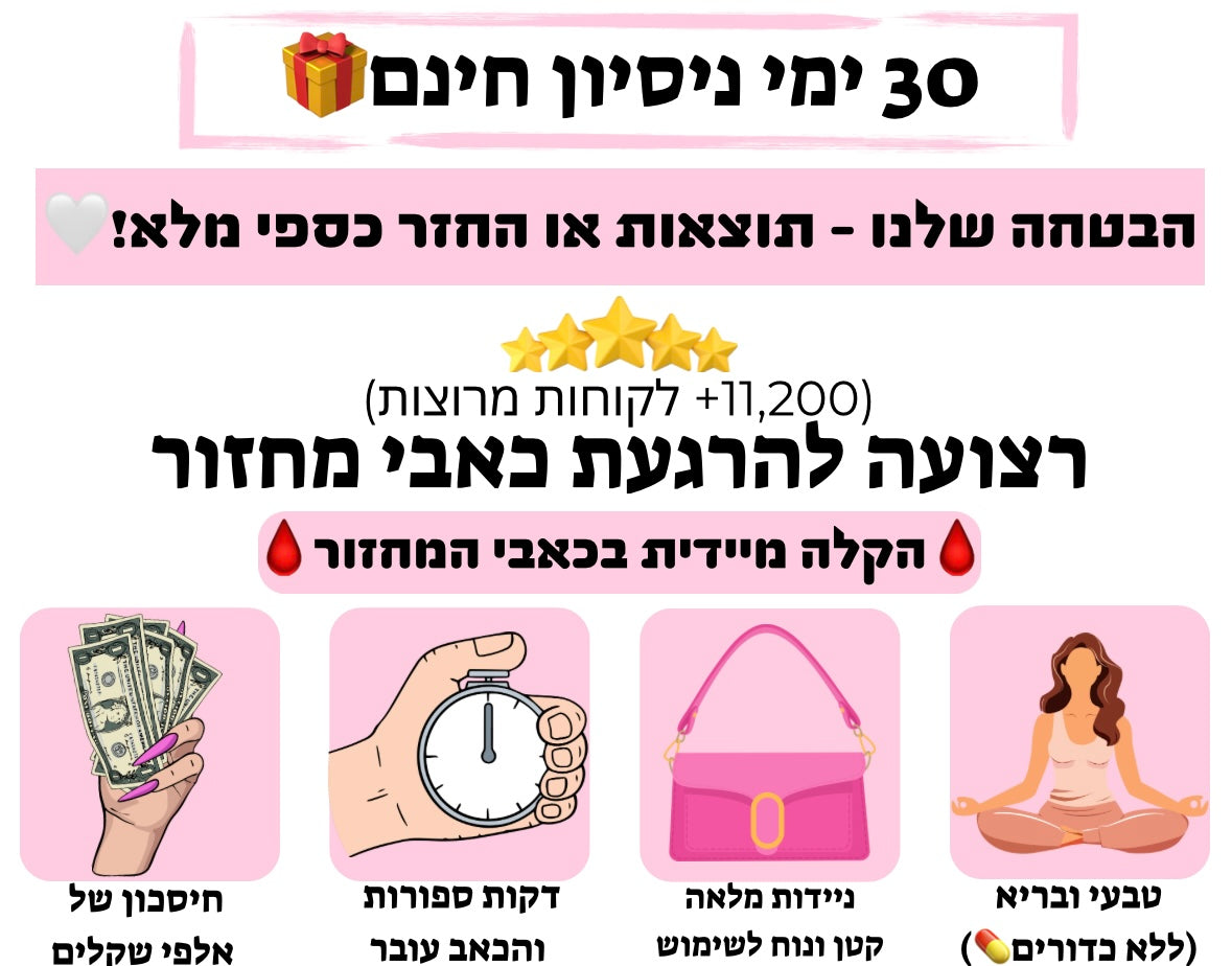 המוצר מגיע עם 30 ימי ניסיון - אם הרצועה לא עזרה לך לאחר 30 ימים מאז שקיבלת אותה, תשלחי אותה אלינו בחזרה ותקבלי החזר כספי.